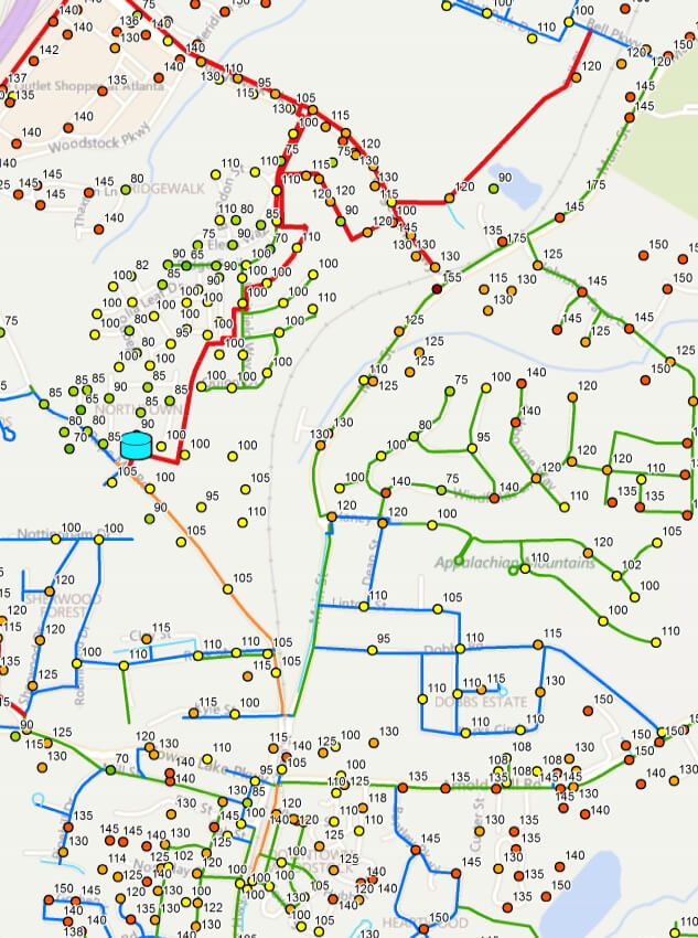 After the top priority of providing clean drinking water to its customers, water utilities need to ensure that proper operating pressures are present at all customer service points. If the pressure is too low, dangerous pathogens may be introduced along the pipeline and reach the end consumer. Too high a pressure, and there is an increased risk of pipe breaks and damage to fixtures. This hydraulic model was used to diagnose pressure issues and determine means to better serve customers in the City's distribution system.